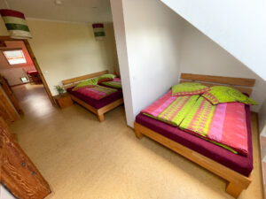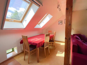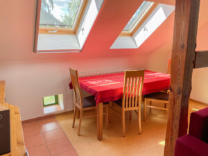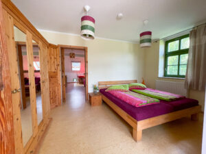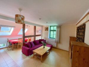 There is a large dining table in the living room of the large holiday flat. The sofa can be used as a sofa bed if the bedroom is too small. Four people sleep comfortably there in a large and a smaller double bed (1.80 m and 1.40 m wide). There is also a kitchen and bathroom with shower.
