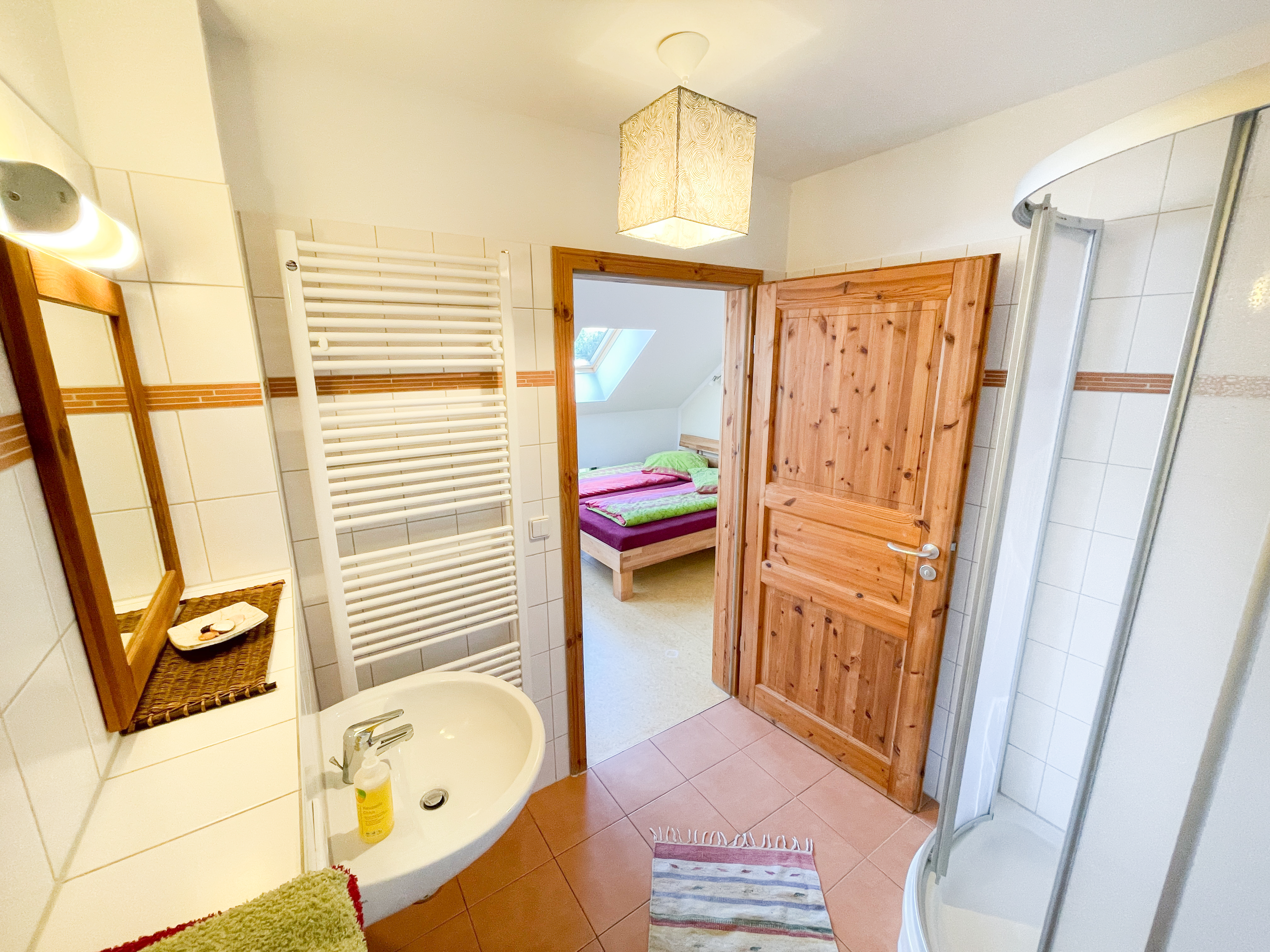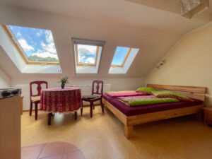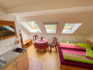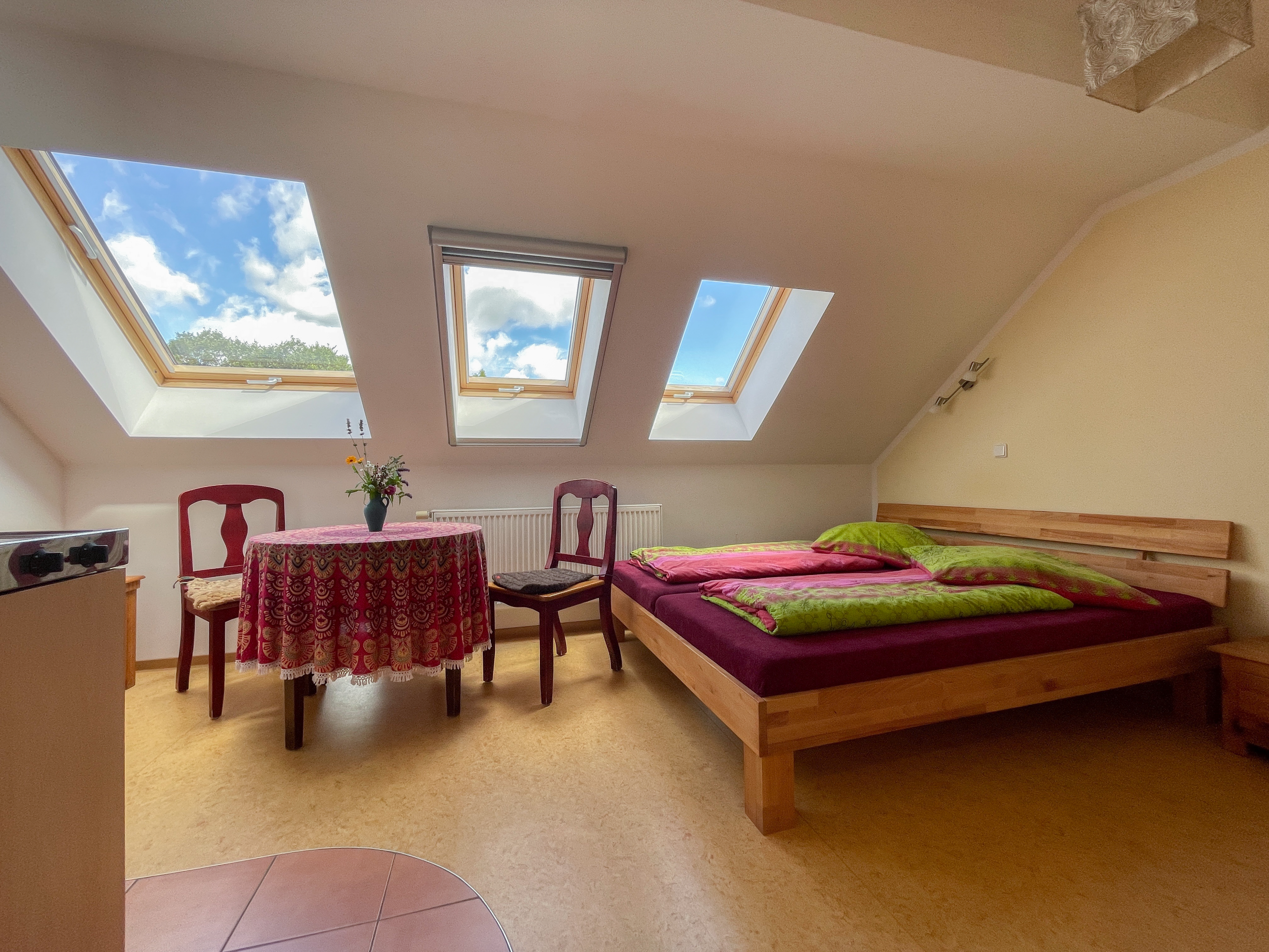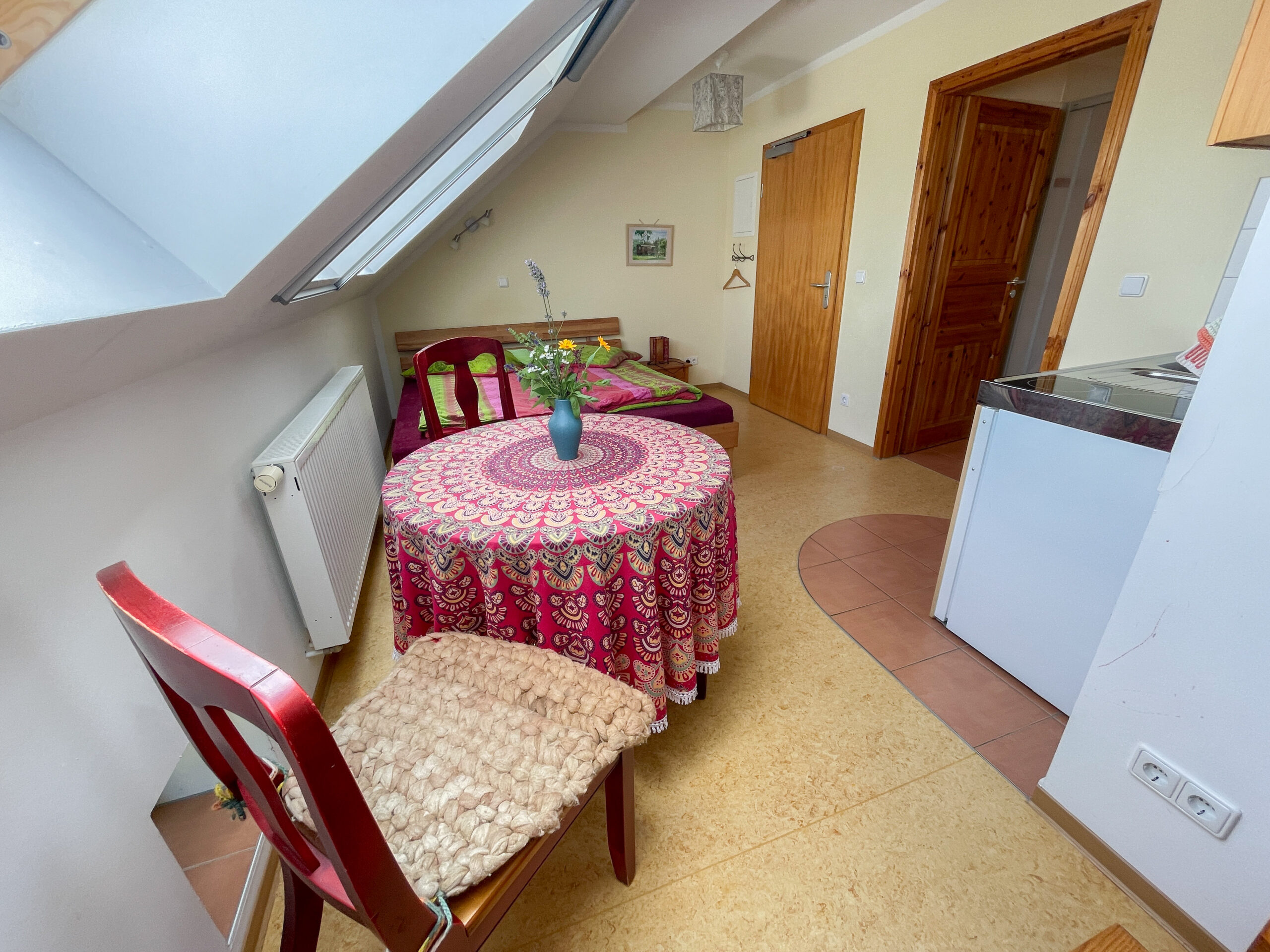 Der weite Ausblick aus den Fenstern unseres kleinen Doppelzimmers über den Deich und die Oder bis nach Polen, faziniert unsere Gäste immer wieder. Neben dem Bett (1,80 m breit), bieten eine kleine Küche + Kühlschrank und ein schönes Bad angenehmen Komfort zum Verweilen. Das kleine Doppelzimmer läßt sich auch gemütlich für Alleinreisende nutzen.